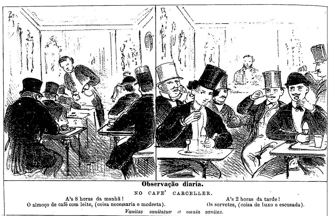 Esse personagem, meio flaneur/meio antropólogo que o Machado coloca como narrador descreve perfeitamente o movimento padrão desse tipo de estabelecimento que, nas décadas de 1860 e 1870, já estavam faziam parte do cotidiano do Rio de Janeiro.